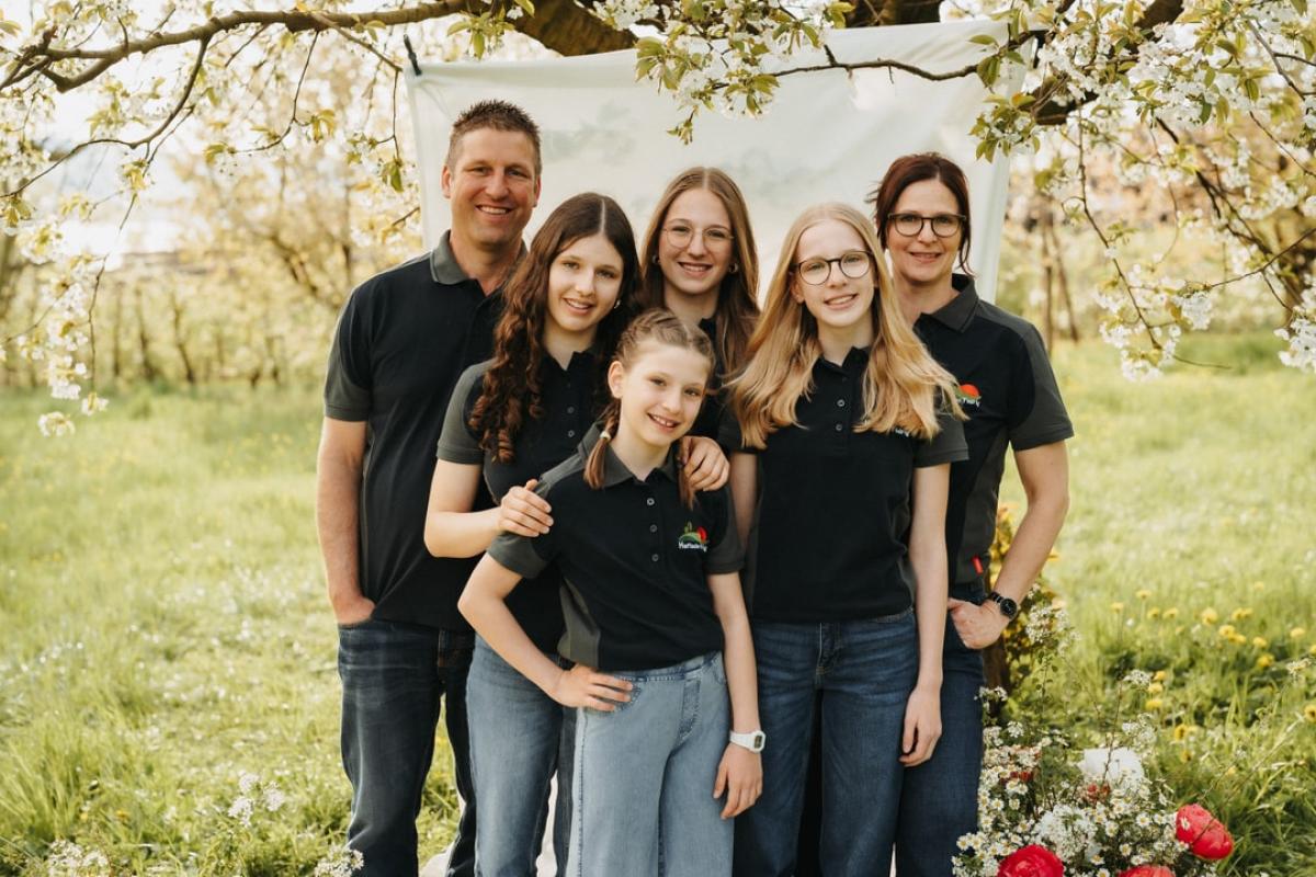 Unsere Familie: Betriebsleiterpaar Dominik (Jg. 1977), Irmgard (Jg. 1978) sowie die vier Mädchen Jana (Jg. 2009), Selina (Jg. 2010), Amanda (Jg. 2012) und Eliane (Jg. 2015).